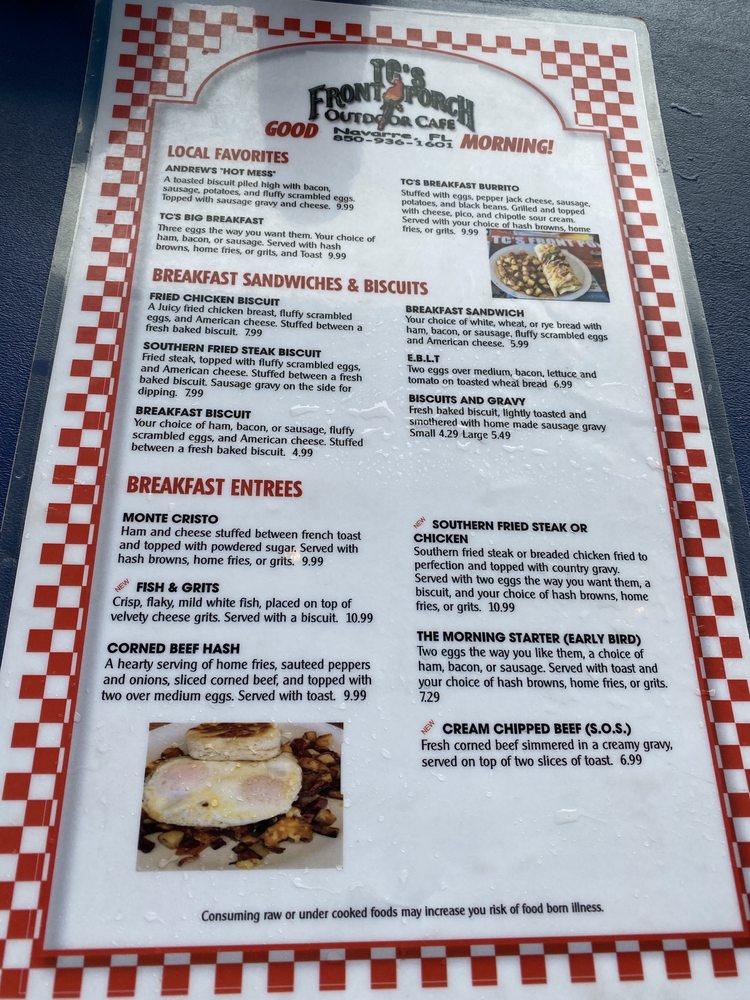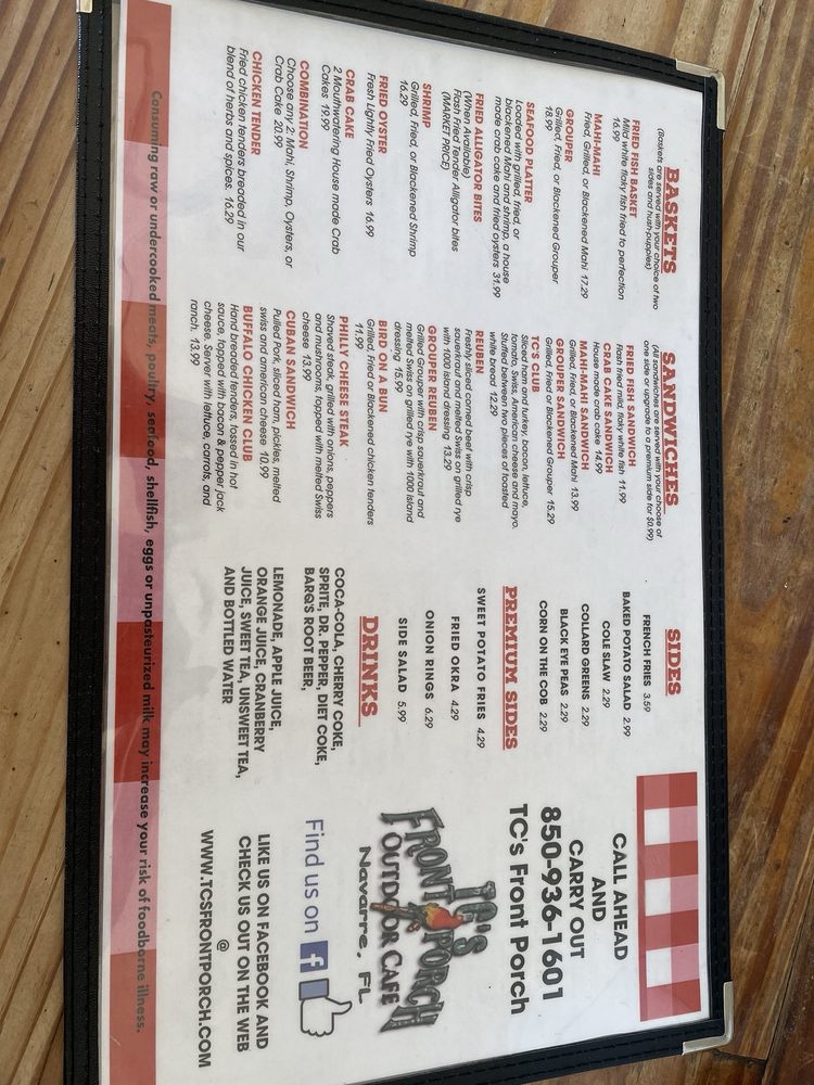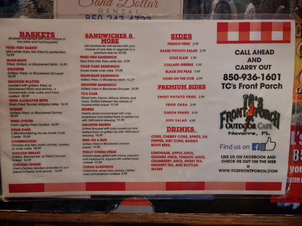 Introducing TC's Front Porch, a cozy American restaurant located in Navarre, FL. This charming spot offers a mix of American cuisine, wine bar selections, and delicious seafood. With a range of options for vegetarians and accommodating various preferences, TC's Front Porch is a welcoming place for all. The atmosphere is casual with moderate noise levels, making it a great spot for families and groups. Customers rave about the friendly service and tasty dishes like French Toast, Gumbo, burgers, and Lobster omelettes. The staff goes above and beyond to ensure a pleasant dining experience, with many visitors returning consistently. With outdoor seating, free Wi-Fi, and even the option for catering, TC's Front Porch truly encapsulates the essence of a neighborhood gem worth visiting.